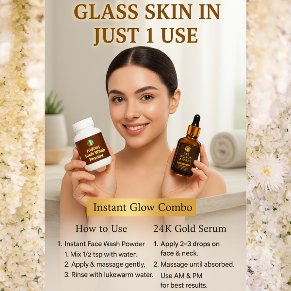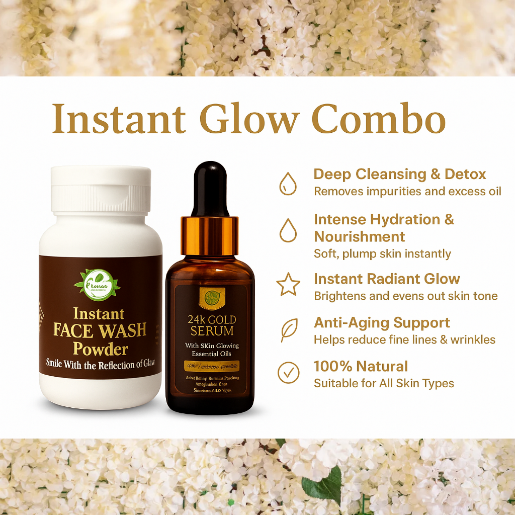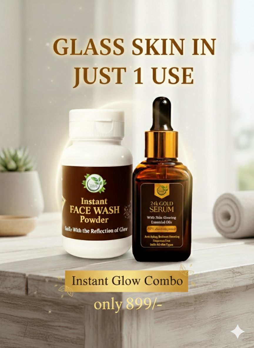 Reveal your natural radiance with our Instant Glow Combo, featuring the Instant Face Wash Powder and the luxurious 24K Gold Serum. Crafted with premium natural ingredients, this duo deeply cleanses, nourishes, and revitalizes your skin—delivering an instant glow you can see and feel.